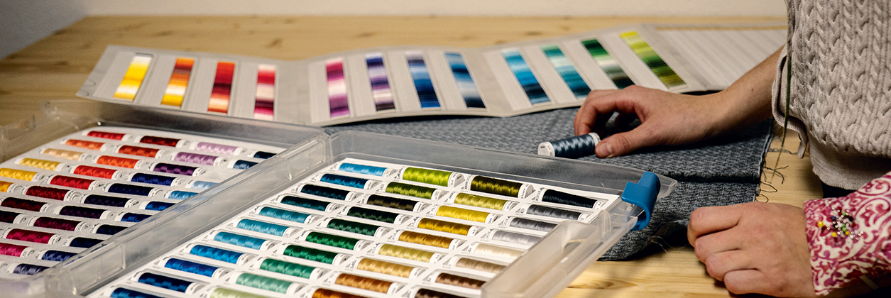 Ein wesentlicher Aspekt ist dabei die Wahl der Stoffe. Dafür hält Christina in ihrer Schneiderei eine beachtliche Auswahl an Stoffmustern bereit, die sie größtenteils von einer Weberei mit modernen Jacquard-Webstühlen am Chiemsee bezieht. Während sie für Mieder und Röcke gerne Woll- oder Seidenbrokat und Samt verwendet, kommen bei den Schürzen eher leichtere, fließende Baumwoll- oder Seidenstoffe zum Einsatz.